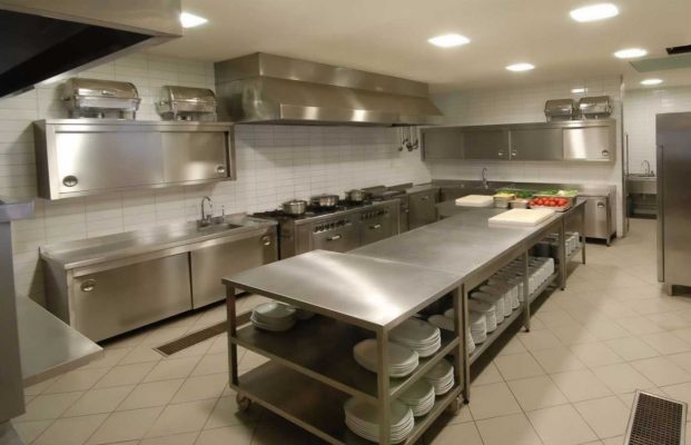 Nhà bếp thương mại hiện đại được trang bị để nấu nướng số lượng lớn và kiểm soát ô nhiễm hiệu quả.