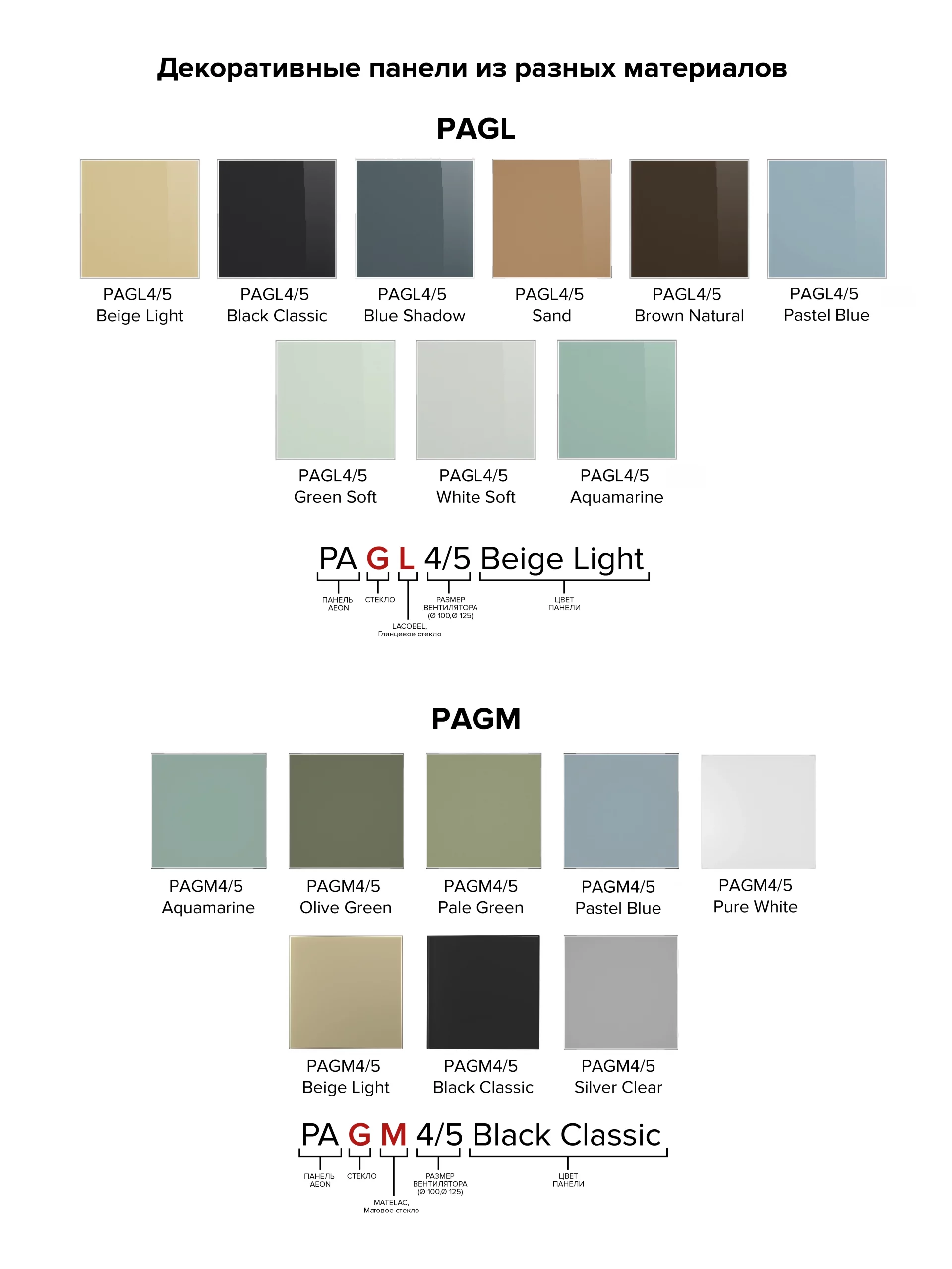 Огромный выбор цветов стильных декоративных накладных панелей из стекла, пластика и металла (приобретаются отдельно) позволяет интегрировать AEON в любой интерьер и обновлять панели при желании, выбирая из разнообразия вариантов. Установка декоративной панели крайне проста: необходимо повернуть декоративную панель на 45°, затем прижать к лицевой панели вентилятора и еще раз повернуть на 45° по часовой стрелке. Таким образом декоративная панель будет надежно зафиксирована. В случае установки вентилятора в потолок необходимо закрепить лицевую панель снизу на корпусе саморезом (входит в комплект).