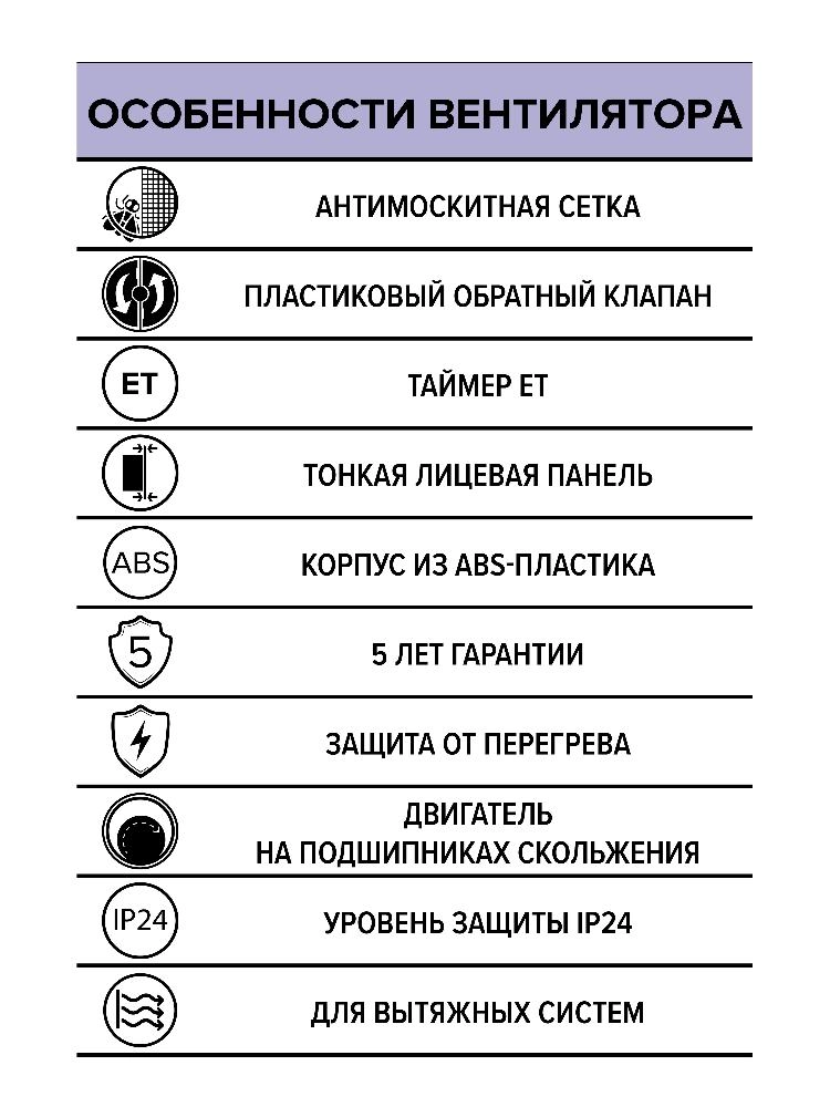 Вентилятор оснащен одноразовым предохранителем для предотвращения возникновения короткого замыкания, обратным клапаном для предотвращения попадания пыли и запахов из вентиляционного канала, антимоскитной сеткой, которая защищает помещение от проникновения насекомых и грязи из шахты.