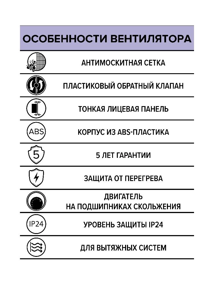 Вентилятор оснащен одноразовым предохранителем для предотвращения возникновения короткого замыкания, обратным клапаном для предотвращения попадания пыли и запахов из вентиляционного канала, антимоскитной сеткой, которая защищает помещение от проникновения насекомых и грязи из шахты.