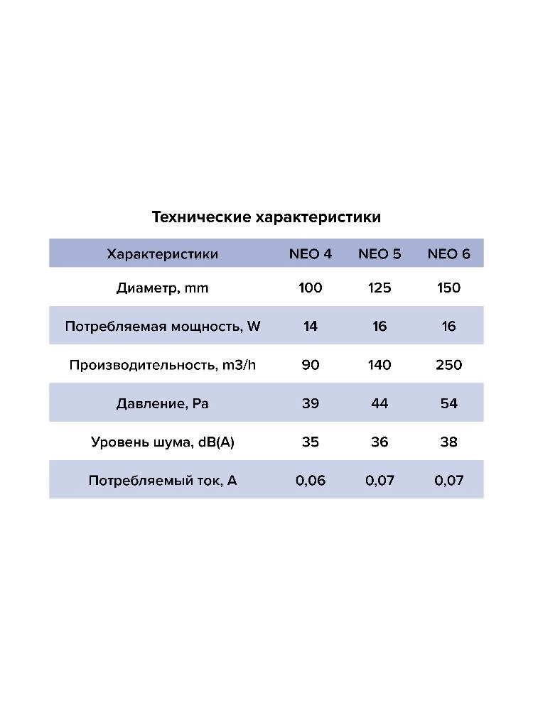 NЕO оснащен одноразовым предохранителем для предотвращения возникновения короткого замыкания, обратным клапаном для предотвращения попадания пыли и запахов из вентиляционного канала, антимоскитной сеткой, которая защищает помещение от проникновения насекомых и грязи из шахты.