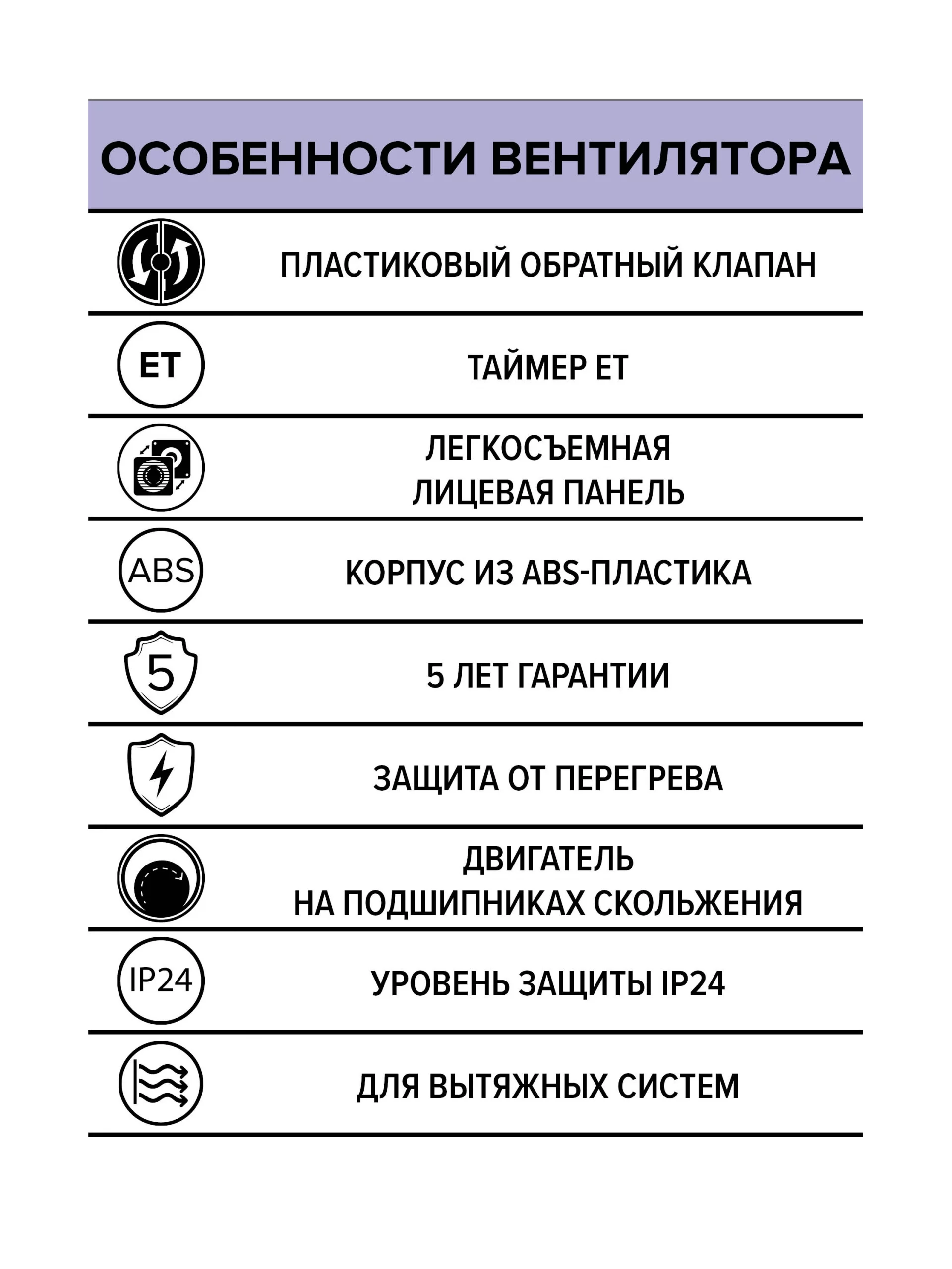 Вентилятор оснащен одноразовым предохранителем для предотвращения возникновения короткого замыкания, обратным клапаном для предотвращения попадания пыли и запахов из вентиляционного канала.