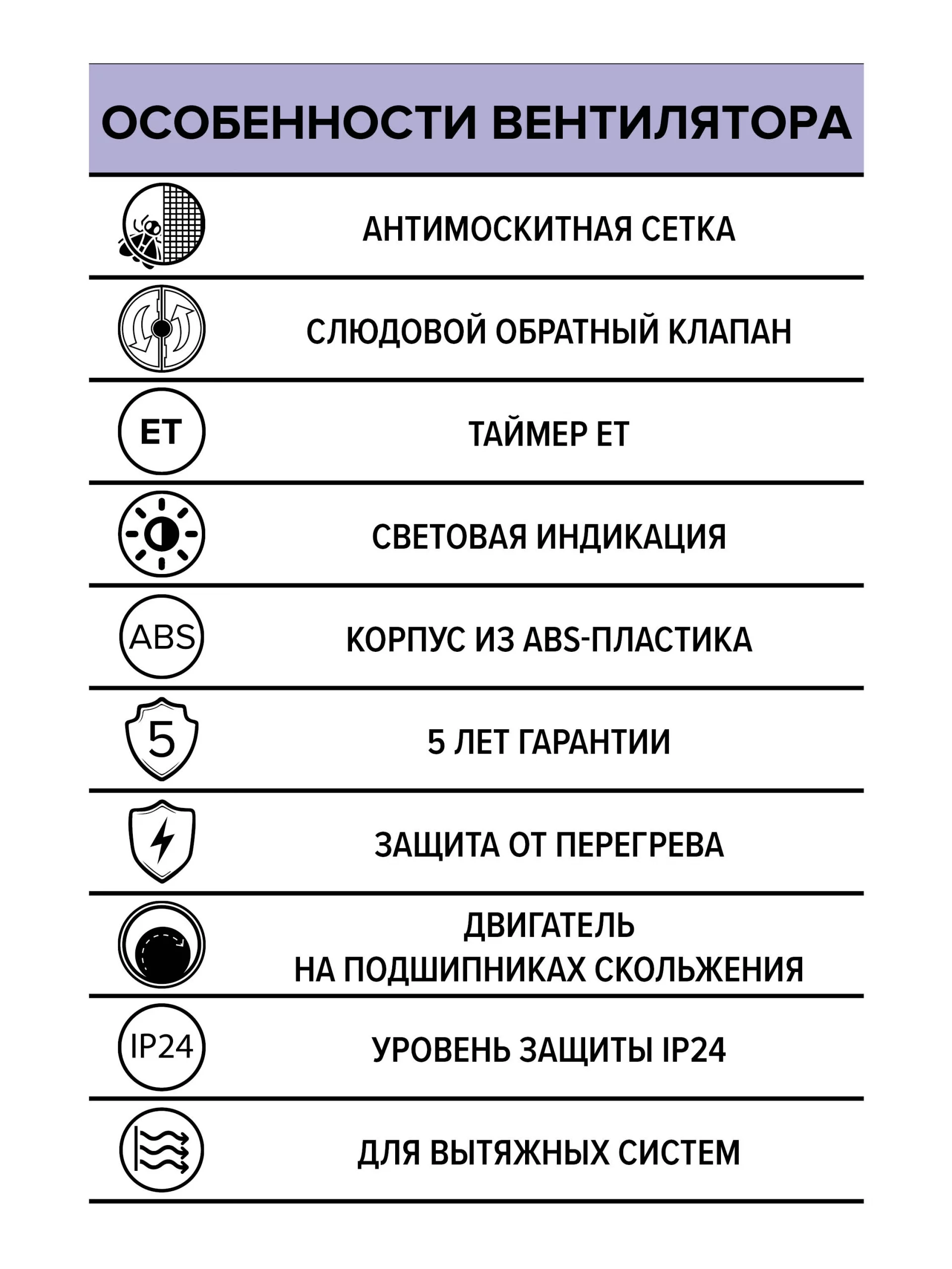STANDARD оснащен одноразовым предохранителем для предотвращения возникновения короткого замыкания, обратным клапаном для предотвращения попадания пыли и запахов из вентиляционного канала, антимоскитной сеткой, которая защищает помещение от проникновения насекомых и грязи из шахты.