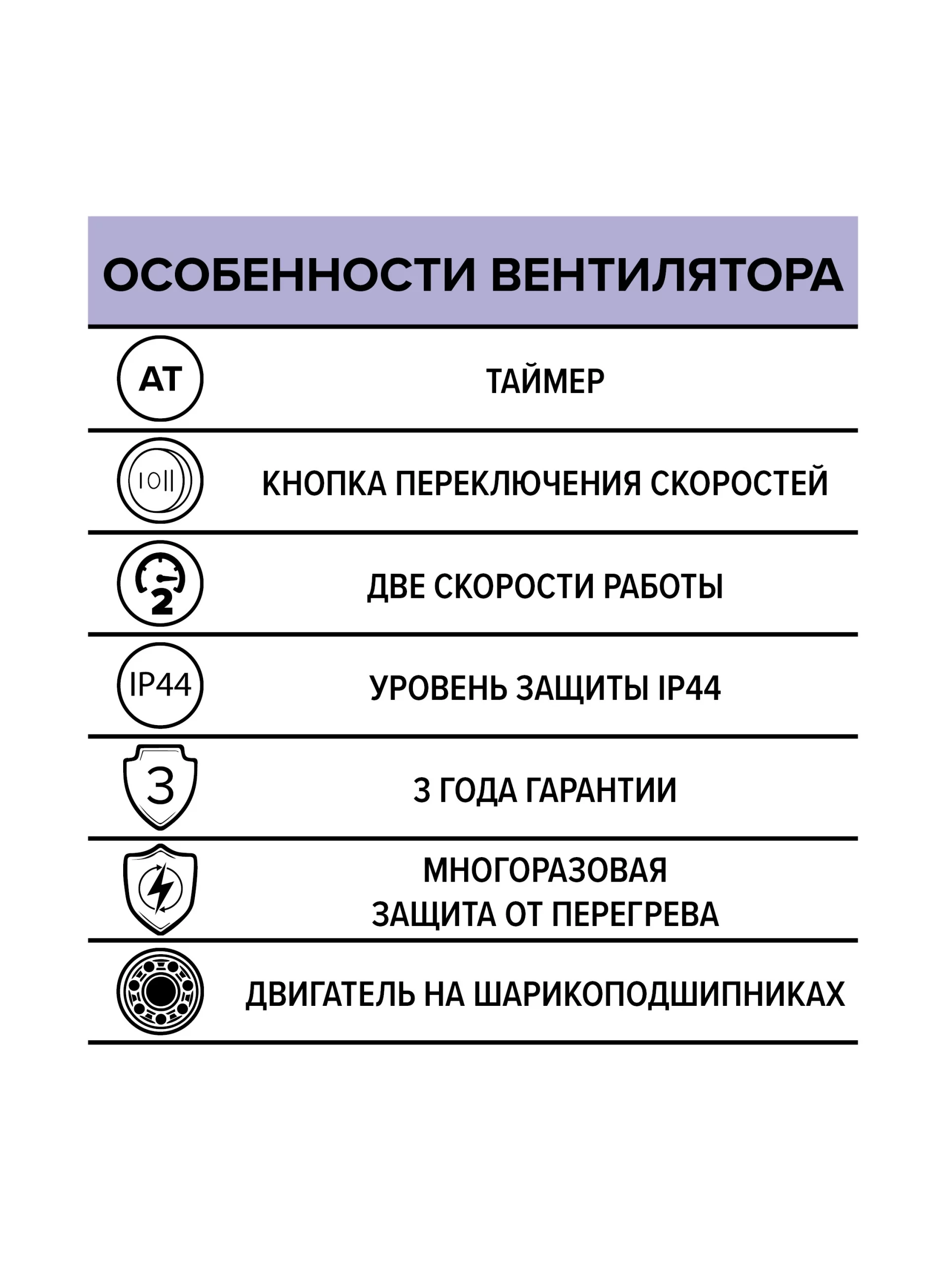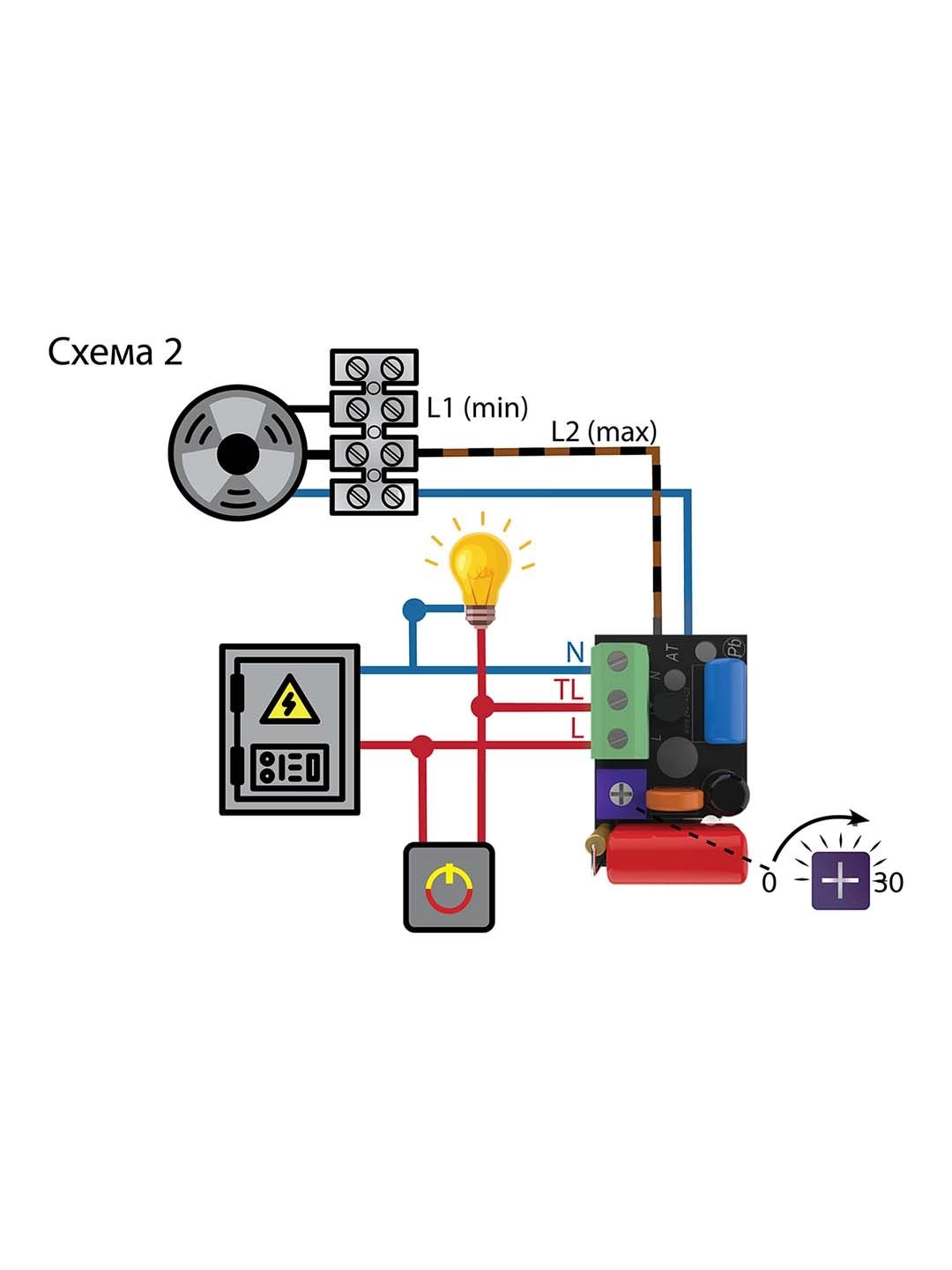 Благодаря опции АТ вентилятор может работать с отсрочкой выключения по таймеру от 0 до 30 минут (при подключении по трехпроводной схеме).