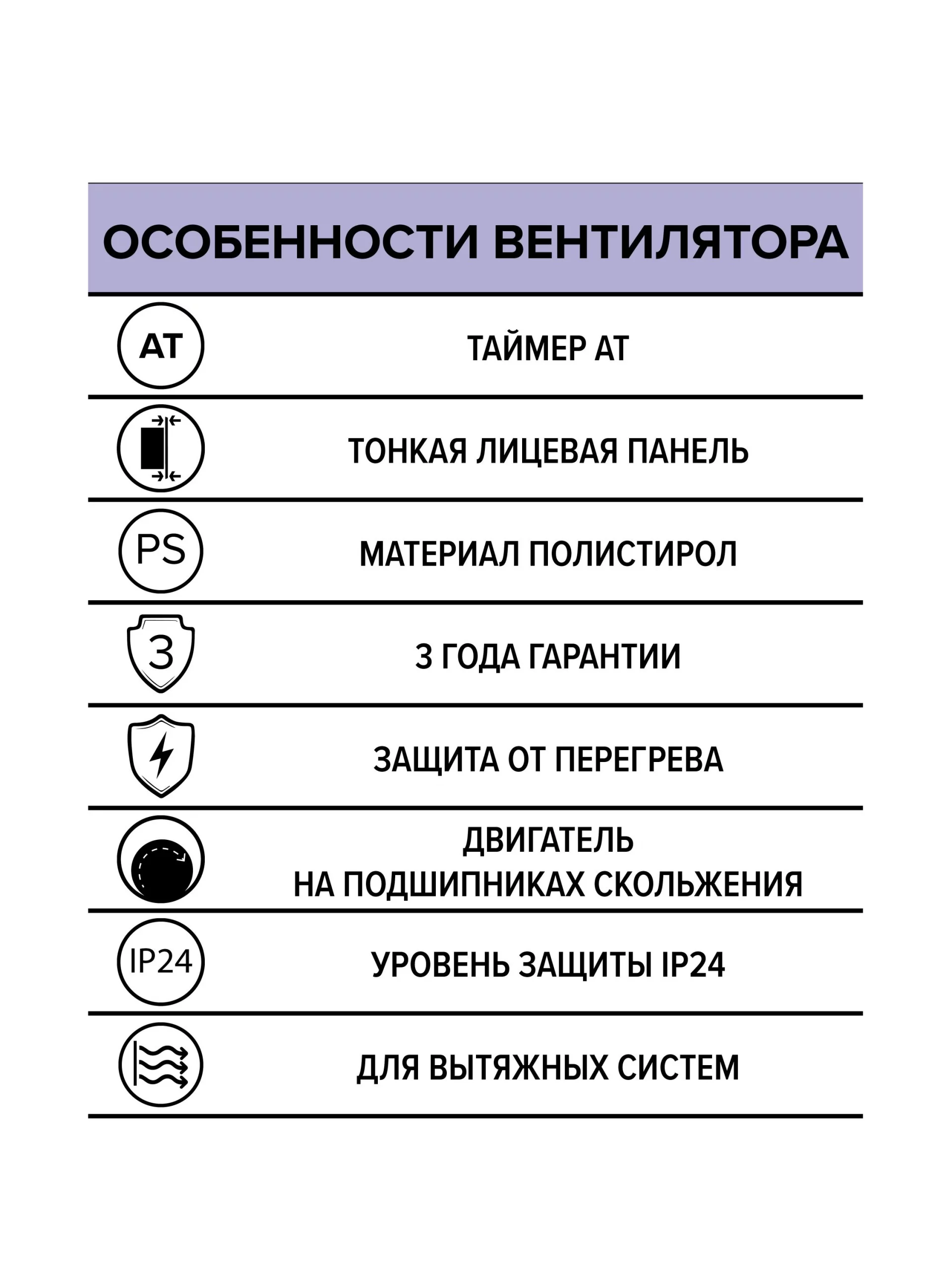 — сверхтонкая лицевая панель позволяет установить вентилятор практически вровень с плиткой или другим покрытием стены,— плата управления АТ. Вентилятор может работать с отсрочкой выключения по таймеру от 0 до 30 минут (при подключении по трехпроводной схеме).