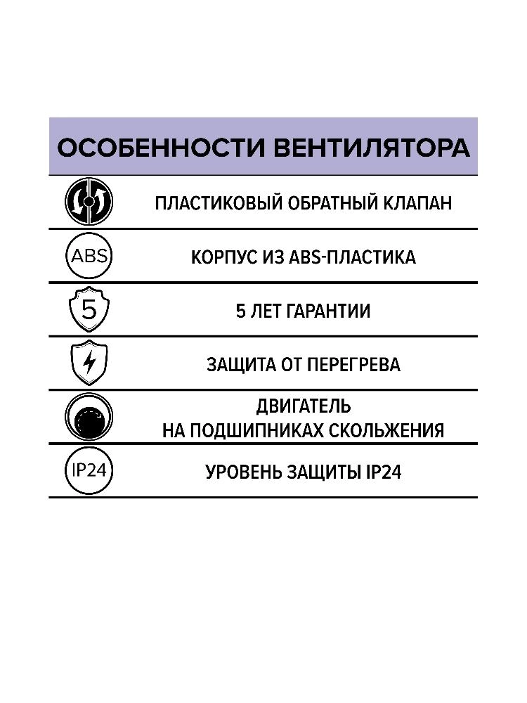 Вентилятор отвечает самым строгим стандартам качества и безопасности. Двигатель на подшипниках скольжения гарантирует вытяжку влажного и загрязненного воздуха. А защита от перегрева автоматически выключит вентилятор при температуре двигателя +115°С – +125°С.