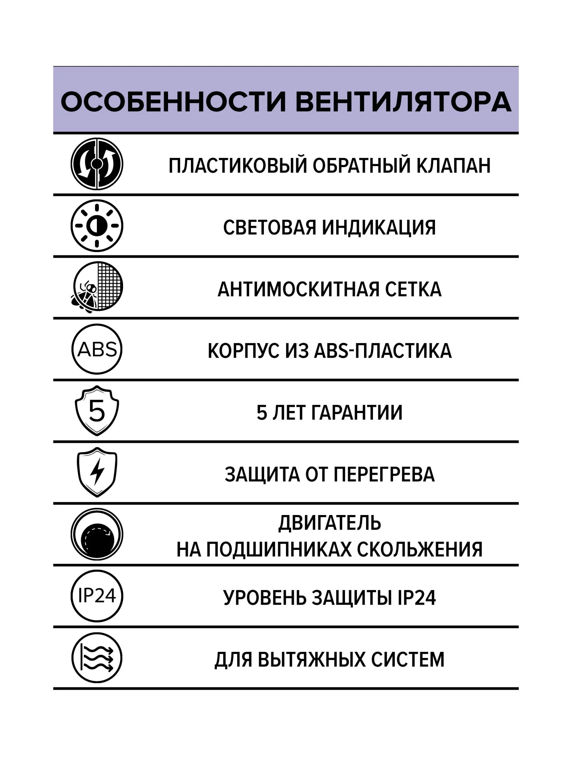 Вентилятор отвечает самым строгим стандартам качества и безопасности. Уровень защиты – IP24. Двигатель на подшипниках скольжения гарантирует вытяжку влажного и загрязненного воздуха. Дополнительно оснащен обратным клапаном, который предотвращает проникновение неприятного запаха из шахты.