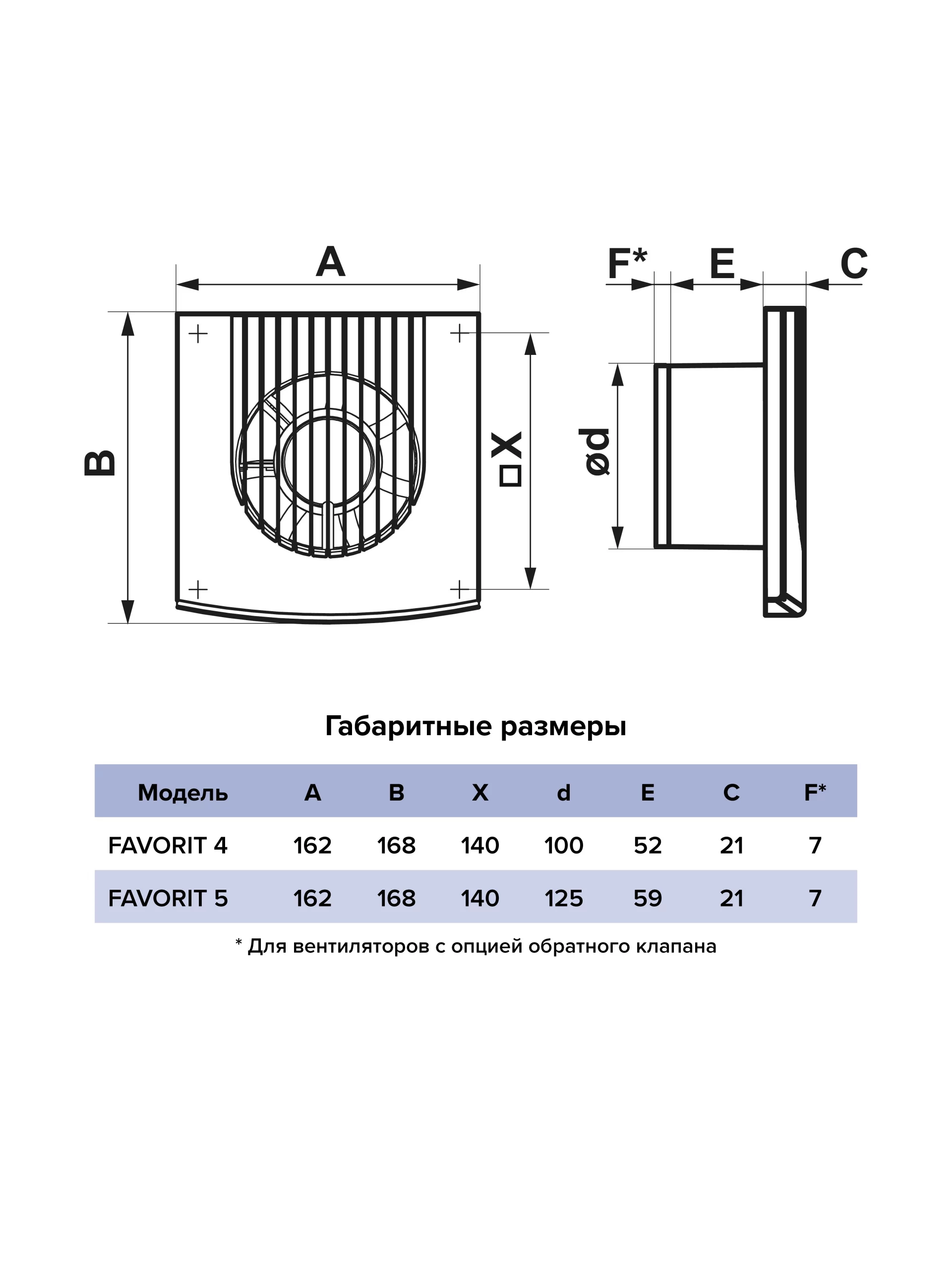 Независимо от диаметра фланца в различных моделях серии FAVORITE   габаритные размеры вентиляторов не меняются.