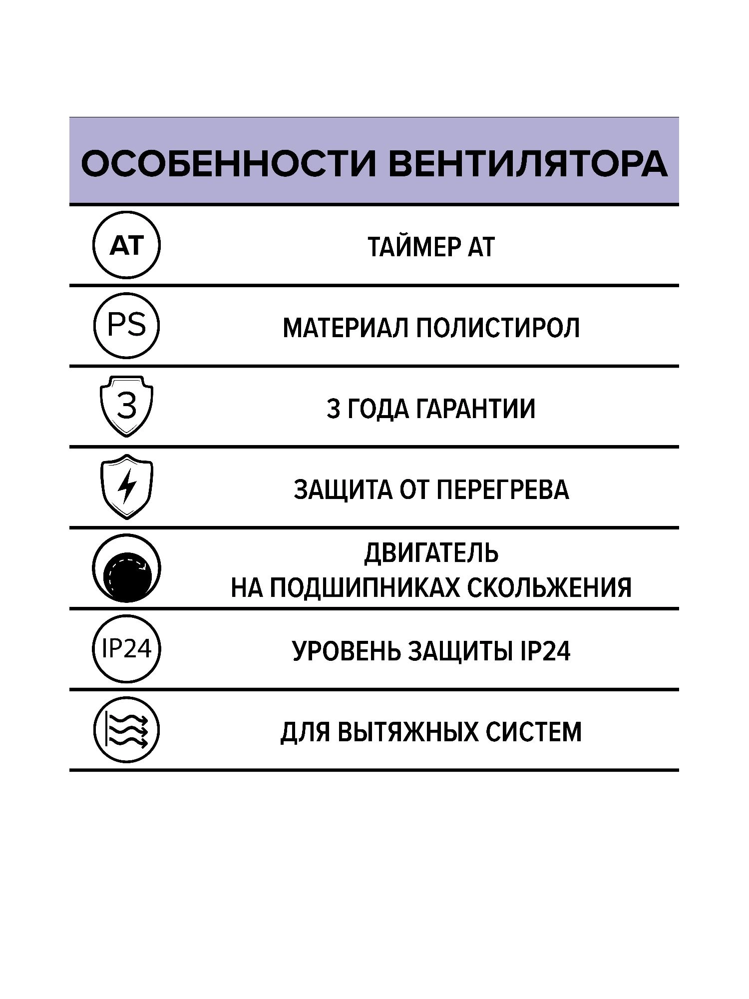 Благодаря опции АТ вентилятор может работать с отсрочкой выключения по таймеру от 0 до 30 минут (при подключении по трехпроводной схеме).