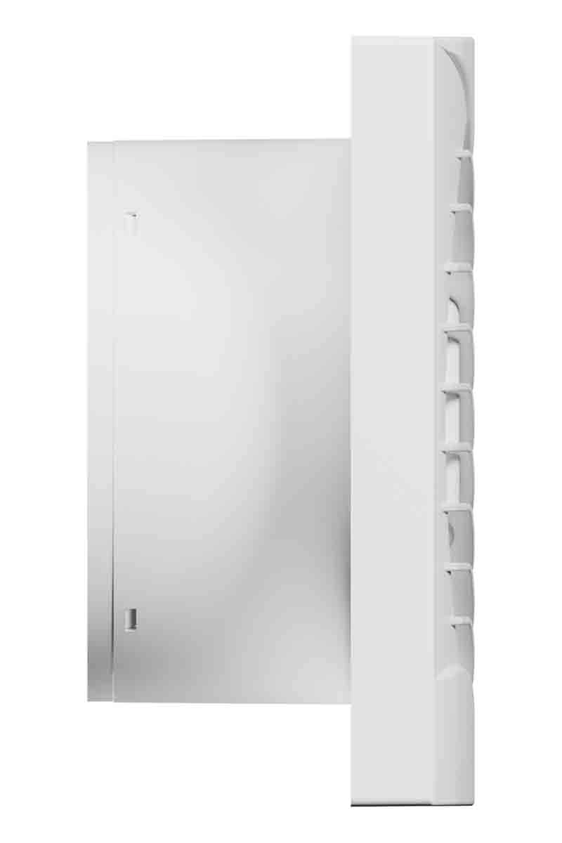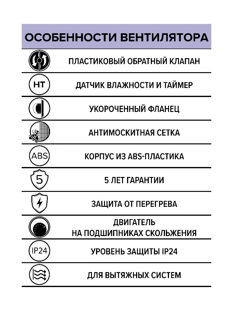 Модель оснащена обратным клапаном с пластиковыми створками и четырьмя защелками, за счет которых клапан надежно фиксируется на фланце вентилятора; платой управления EТ с электронным таймером и датчиком влажности. Это позволяет настроить время работы с помощью переключателей. Интервалы работы 5, 15 или 30 минут. По умолчанию после нажатия на выключатель устройство отработает 15 мин. При необходимости можно изменить интервал работы либо отключить таймер. Датчик влажности в типовом режиме включится автоматически, когда зафиксирует влажность свыше 70 % и выключится после ее снижения. Также возможно настроить следующие значения влажности: 50 % или 90 %. Либо отключить встроенный датчик влажности совсем.