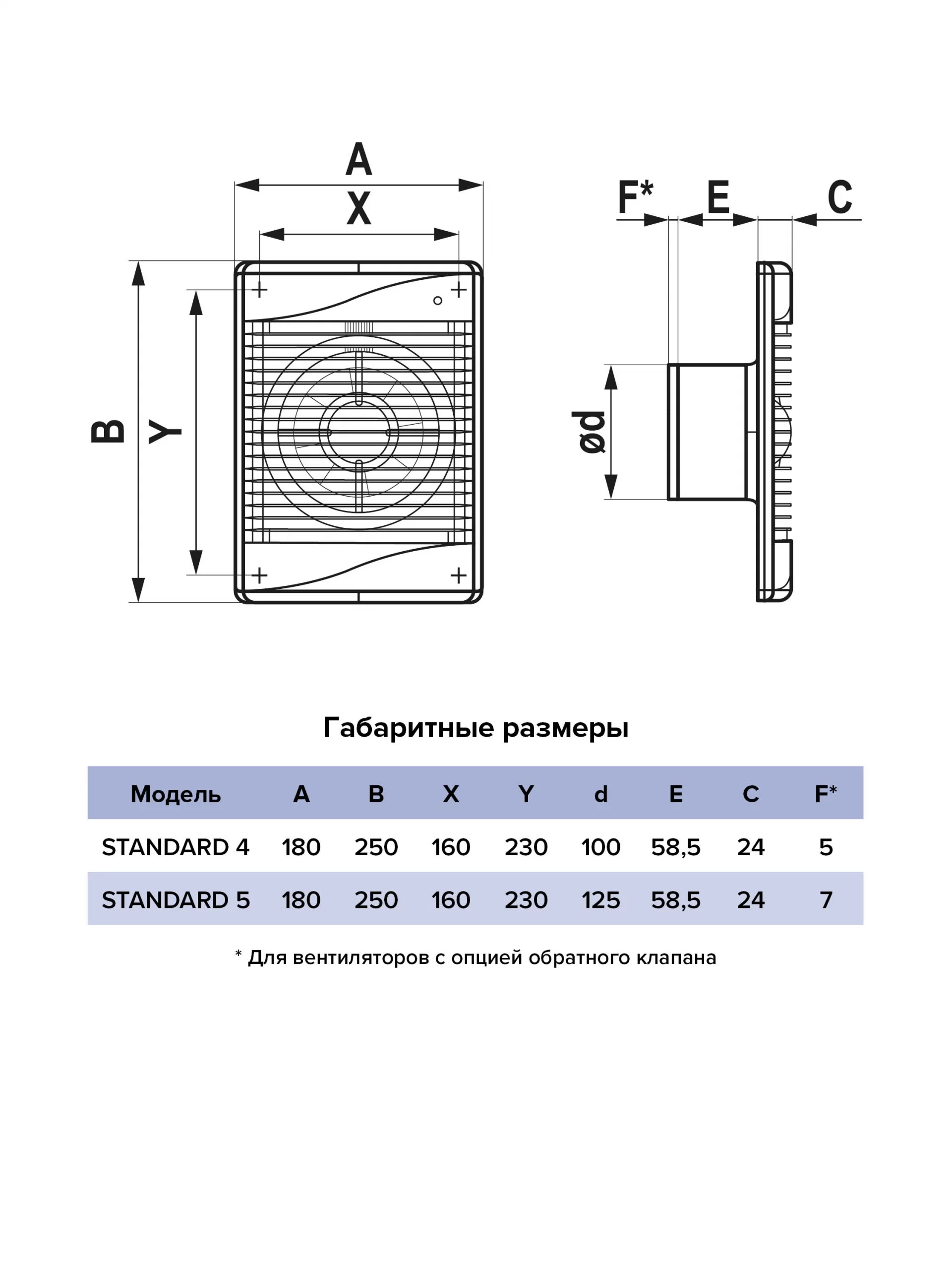 В ассортименте вентиляторы с фланцем диаметром 100 и 125 мм. Монтажные размеры на всех моделях одинаковы.
