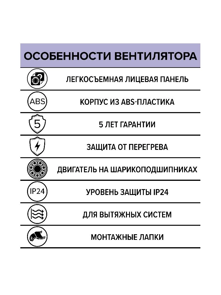 Благодаря высокой производительности (100 м³/ч) вентилятор эффективно удаляет из помещения влажный загрязненный воздух и неприятные запахи.