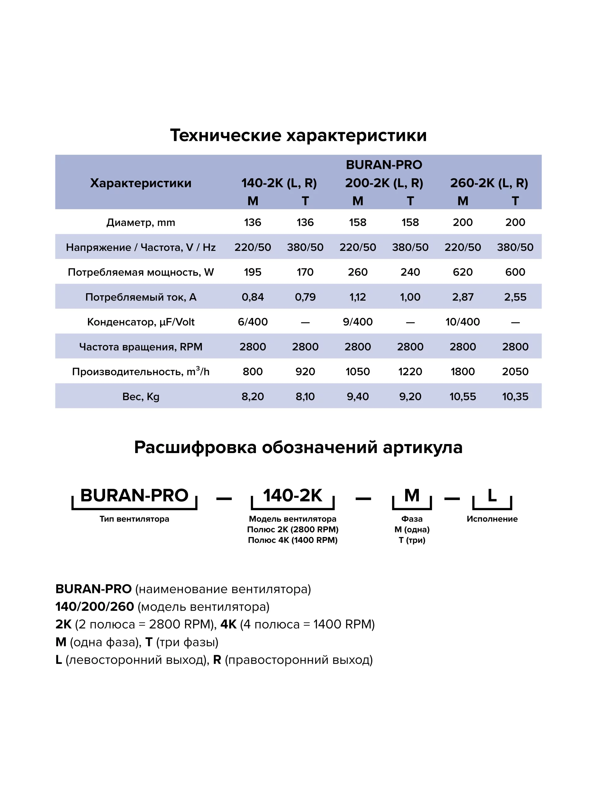 В вентиляторах BURAN PRO 140 2K M L, BURAN PRO 200 2K M L, BURAN PRO 260 2K M L установлен двухполюсной двигатель, выходное отверстие находится слева относительно оси двигателя.