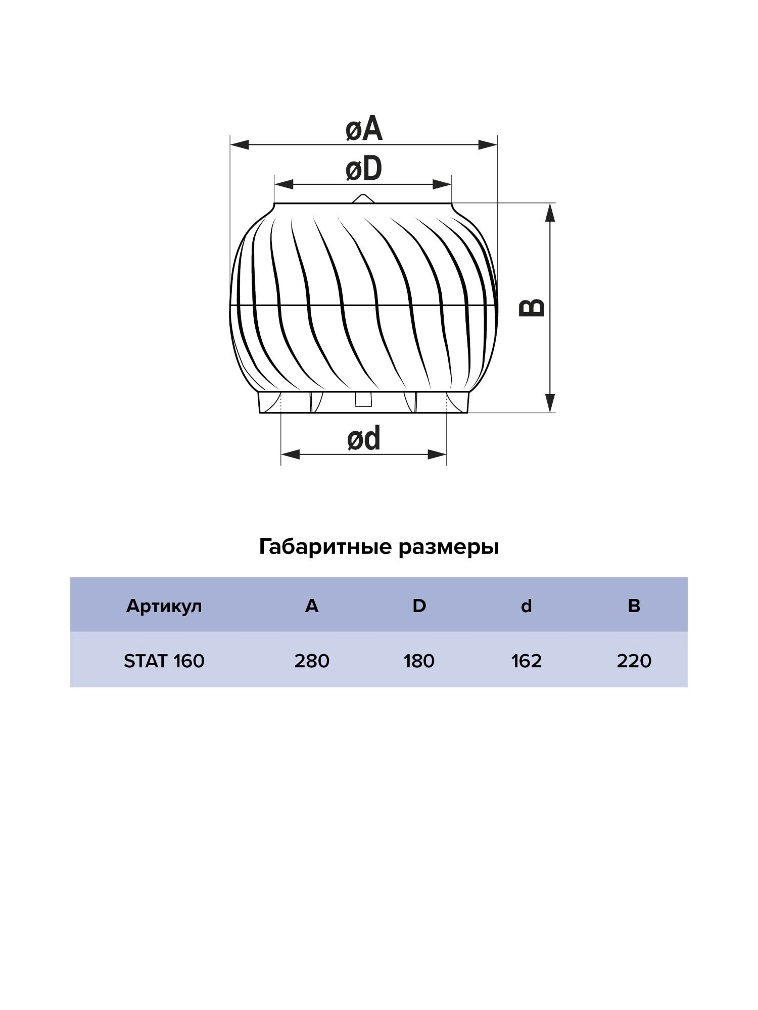 STAT 160 является экологичным решением, так как работает без электричества — от ветра, а также за счёт разницы температур. Способствует удалению загрязненного воздуха и избыточной влажности из помещений и подкровельного пространства. Нормализуют циркуляцию воздуха в помещении. Создает дополнительную тягу в вентканале, препятствует попаданию в канал атмосферных осадков, птиц, мусора. Устойчивы к окислению, воздействию влаги и солнца; не создает вибраций, легко монтируется. Изготовлен из ABS-пластик с УФ-стабилизацией.