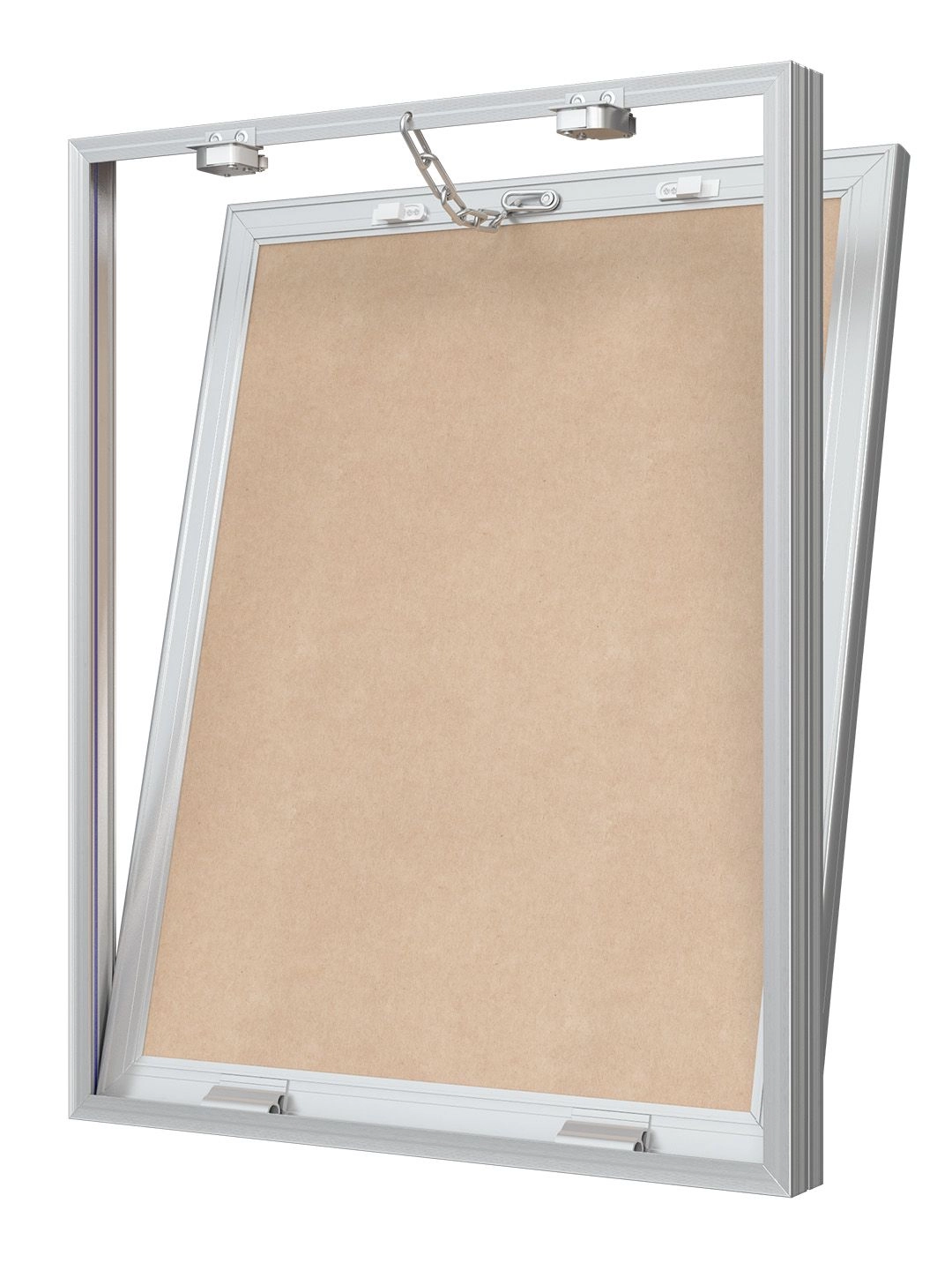Люки изготавливаются из алюминиевого профиля. Дверца заполнена влагостойким гипсокартоном (ГКЛВ). Конструкция оснащена нажимным замком, резиновым уплотнителем, страховочным механизмом для безопасного открытия дверцы, имеет возможность полного снятия дверцы. Максимальный угол открытия — 180 градусов.