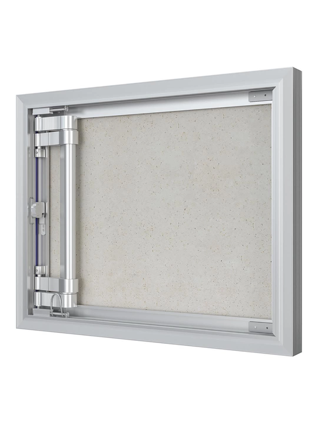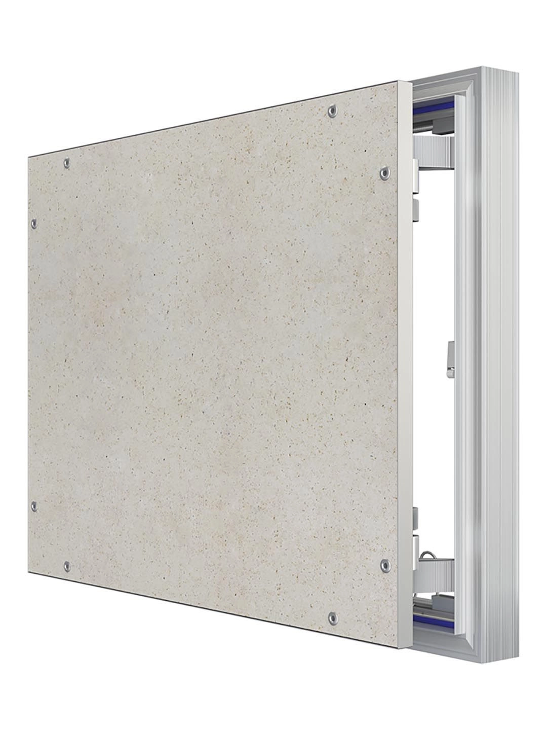 Распашная дверца с фронтальным открытием люка сохраняет общий рисунок поверхности без подрезки и подгонки плитки.