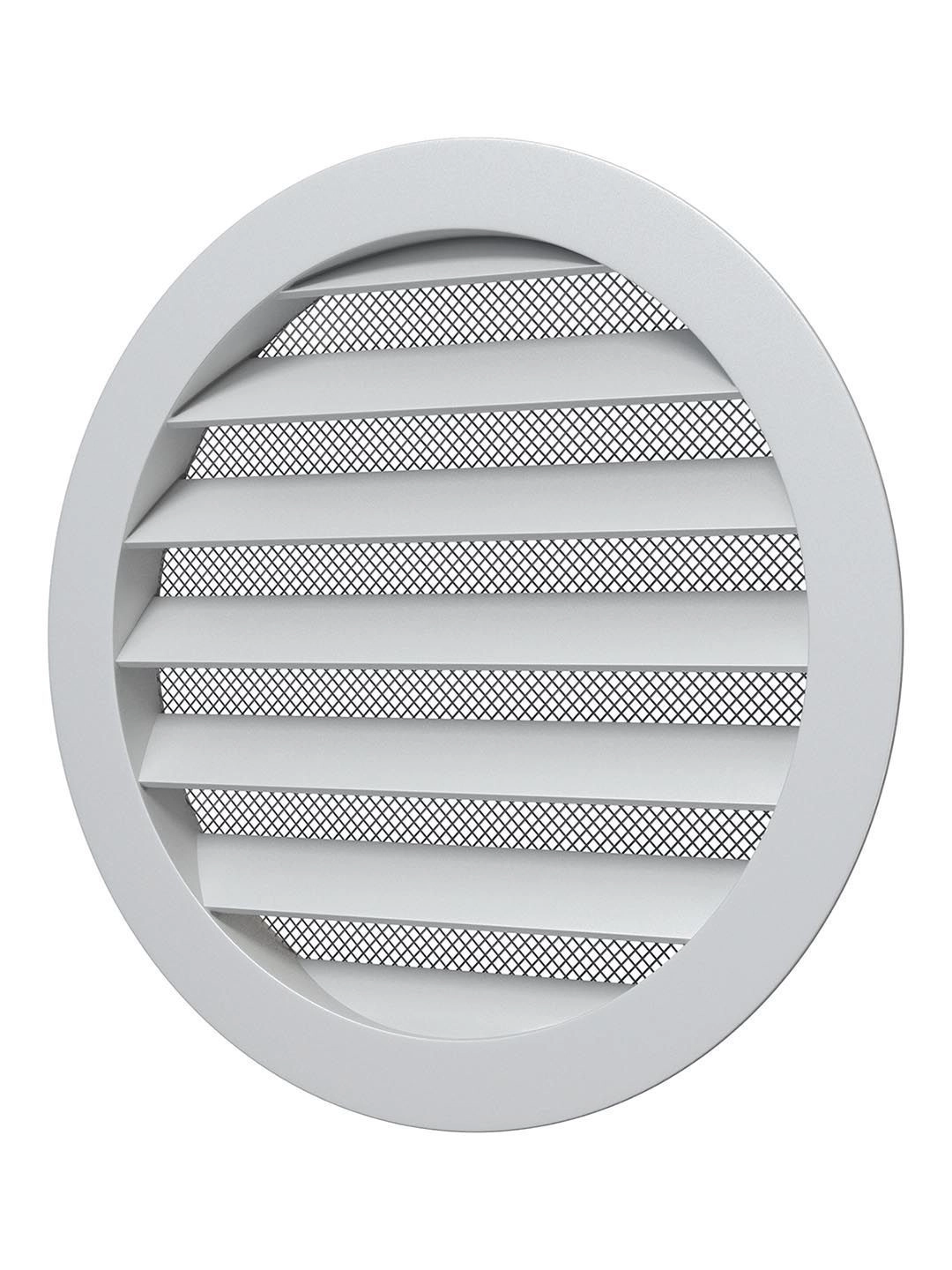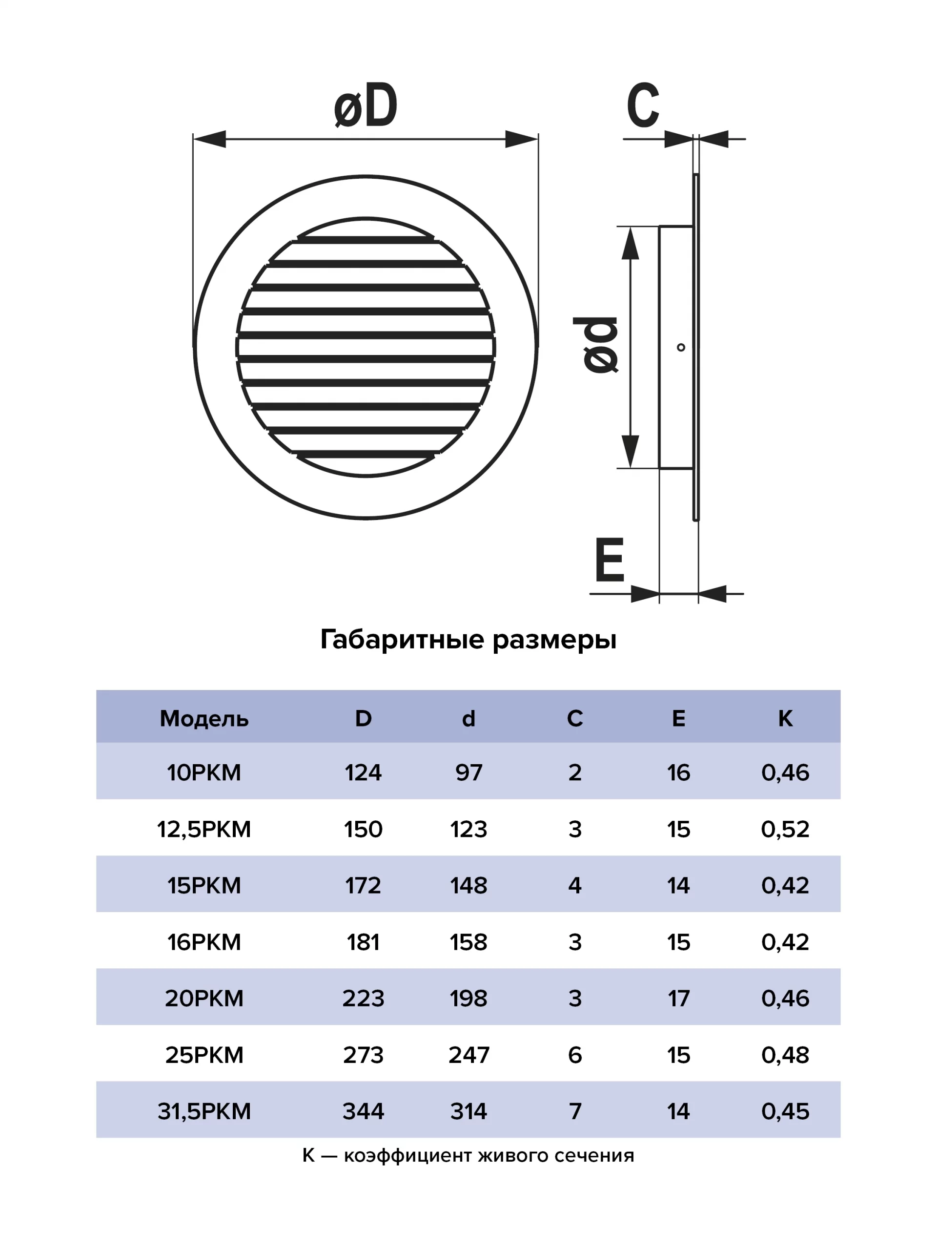 Наружная приточно-вытяжная решетка РКМ монтируется на внешних стенах. Имеет наклонные жалюзи, скрывающие от глаз вентиляционный канал. Решетка изготовлена из алюминиевого сплава, антимоскитная сетка — из нержавеющей стали. Соединяется с воздуховодами через круглый фланец.