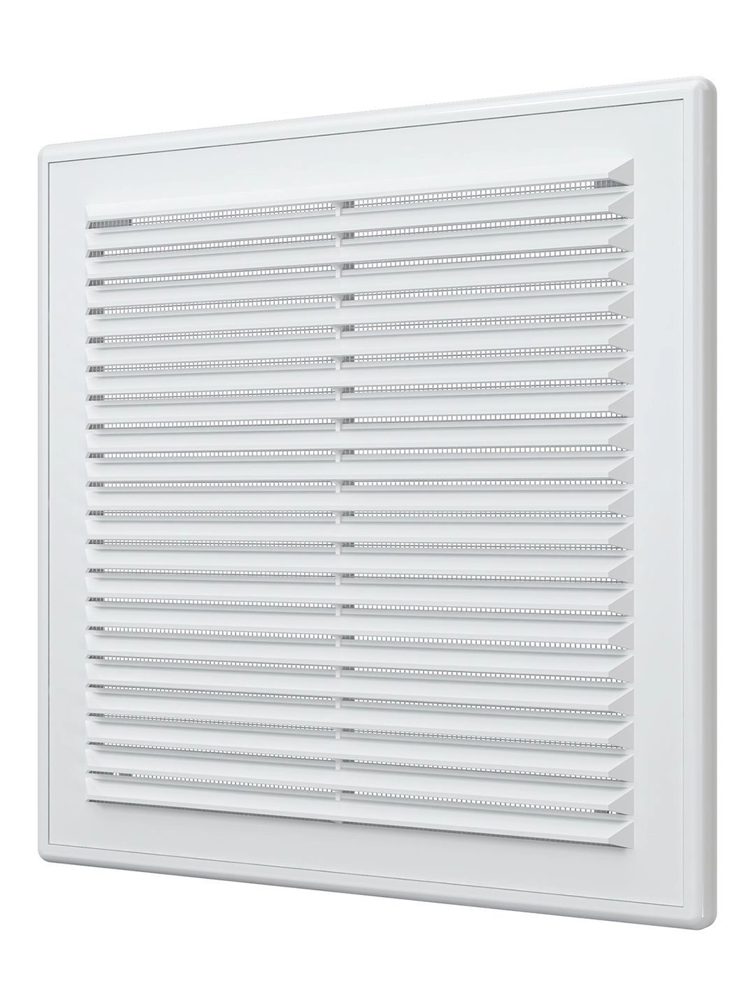 Вентиляционная решетка Р состоит из двух частей: рамки и решетки с жалюзи. Решетка не крепится непосредственно к стене или к потолку, а вставляется в рамку, которая монтируется на поверхности. Это позволяет легко снимать изделие для обслуживания: необходимо достать решетку из рамки, а затем также легко вернуть на место. Решетка оснащена наклонными жалюзи, которые помогают скрыть вентиляционный выход, а также антимоскитной сеткой для защиты от насекомых. Решетки Р представлены также в коричневом, бежевом и черных цветах.