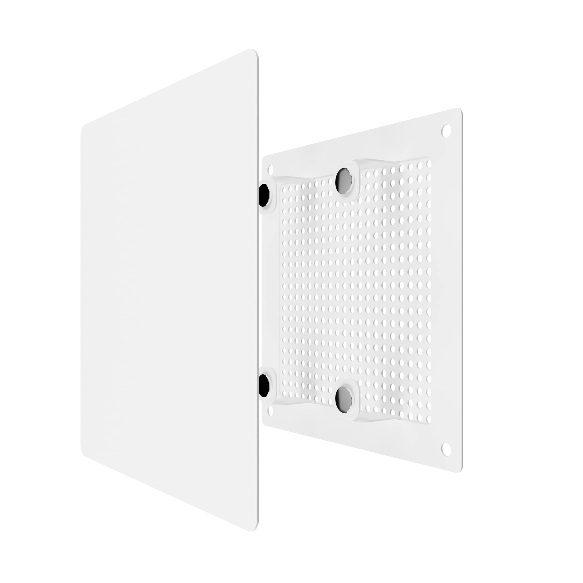 RVM состоит из двух частей. Рамка с сеткой и магнитами крепится к поверхности при помощи саморезов или клея, декоративная панель фиксируется на рамку с помощью магнитов, благодаря чему легко снимается для обслуживания решетки, скрывает вентиляционное отверстие и крепление рамки. За счет такой конструкции доступ воздуха в шахту не перекрывается и происходит его равномерное распределение.