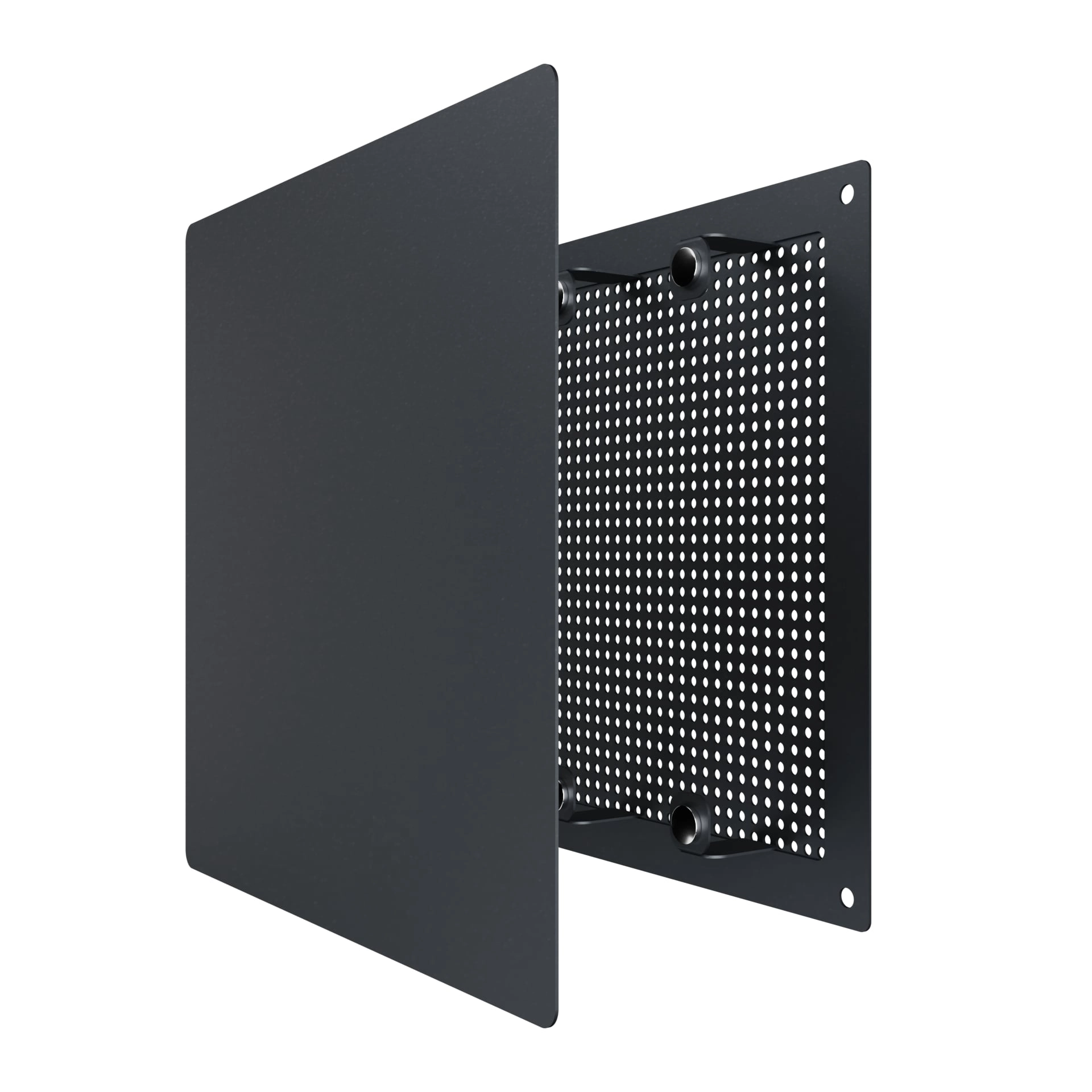 RVM состоит из двух частей. Рамка с сеткой и магнитами крепится к поверхности при помощи саморезов или клея, декоративная панель фиксируется на рамку с помощью магнитов, благодаря чему легко снимается для обслуживания решетки, скрывает вентиляционное отверстие и крепление рамки. За счет такой конструкции доступ воздуха в шахту не перекрывается и происходит его равномерное распределение.