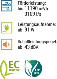 Radialventilatoren mit EC-Motor für Luftkanäle. Maximale Förderleistung bis zu 11190 m³/h.