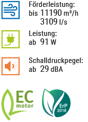 Radialventilator mit EC-Motor für Luftkanäle. Maximale Förderleistung bis 11190 m³/h.