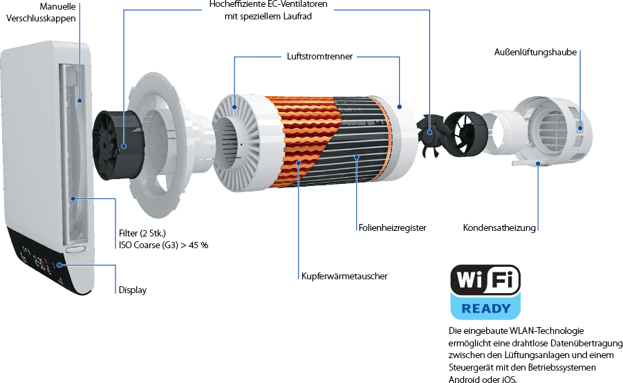 Duale Einzelraumlüftungsanlage mit WRG, WLAN-fähig