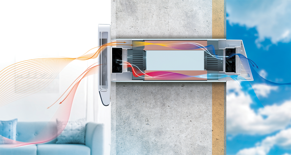 Der Freshpoint-E ist für den Einsatz in Schlafzimmern, Wohnzimmern und ähnlichen Wohnräumen vorgesehen. Die Lüftungsanlagen sind für den Einbau in Außenwände von Gebäuden in dafür vorbereitete Kernlochbohrungen konstruiert. Der Freshpoint-E verfügt über einen Kupferwärmetauscher, bei dem das Kondensat durch ein Loch in der Außenhaube nach außen abgeleitet wird. |