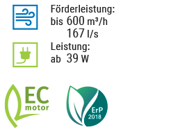 Die Ventilatoren weisen hocheffi ziente, elektronisch kommutierte (EC) Gleichstrommotoren auf.Die EC-Technik erfüllt die aktuellen Anforderungen an energieeffi ziente, kontrollierte Lüftung. Der Energieverbrauch bei EC-Motoren ist bis zu 35 % niedriger als der von Asynchronmotoren.EC-Motoren sorgen für eine optimale Steuerung im ganzen Drehzahlbereich des Ventilators und sind mit einem Überhitzungsschutz mit automatischem Neustart ausgestattet.Der EC-Motor hat keine Schleif- und Verschleißteile wie Kommutatoren und Bürsten. Diese Teile wurden durch eine wartungsfreie EC-Steuerplatine ersetzt.Das Laufrad ist dynamisch ausgewuchtet.Der Ventilator kann mit einer Stromversorgung von 50 Hz und 60 Hz betrieben werden. Die maximale Drehzahl ist nicht von der Stromfrequenz abhängig. |