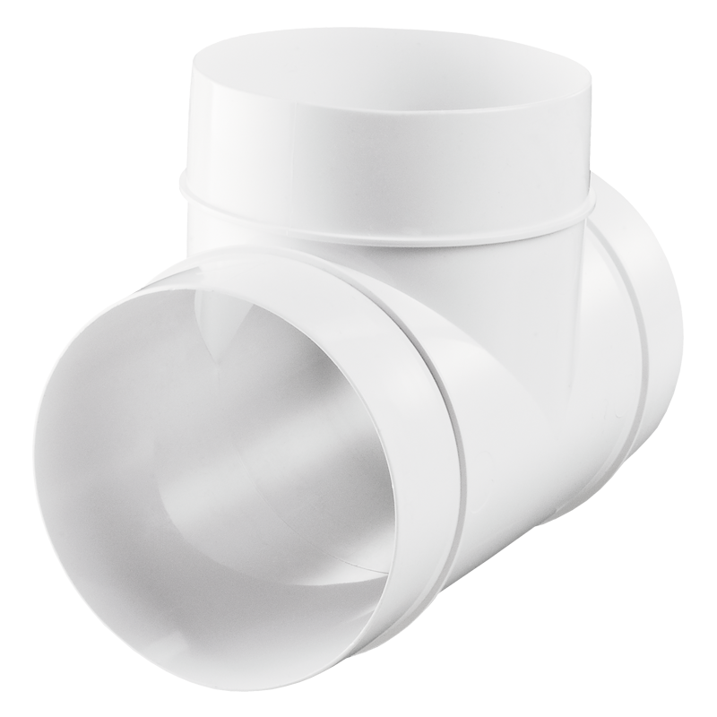 Verbindung von Lüftungsrohren mit gleichem Durchmesser und Integration in komplexe Lüftungssysteme. Material: Kunststoff, weiß. Das T-Stück ermöglicht die Montage von drei Lüftungsrohren mit gleichem Durchmesser und einem Winkel von 90°.