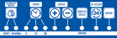 • FEUCHTIGKEITS-NACHLAUFSCHALTER – Einstellung der Laufzeit des Ventilators für vollständigen Feuchtigkeitsentzug nach Stabilisierung der Raumfeuchtigkeit (30, 45, 60 min).