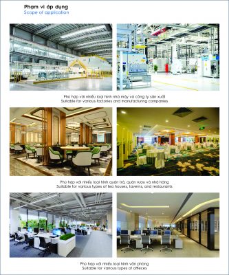 4. Ứng dụng trong thương mại: tòa nhà văn phòng, trung tâm mua sắm, nhà hàng, trường học, căng tin, quán cà phê internet, phòng tập thể dục,nhà hàng lẩu, phòng chơi cờ vua và bài, phòng bi-a và các khu vực ngoài trời khác có yêu cầu giảm nhiệt độ.